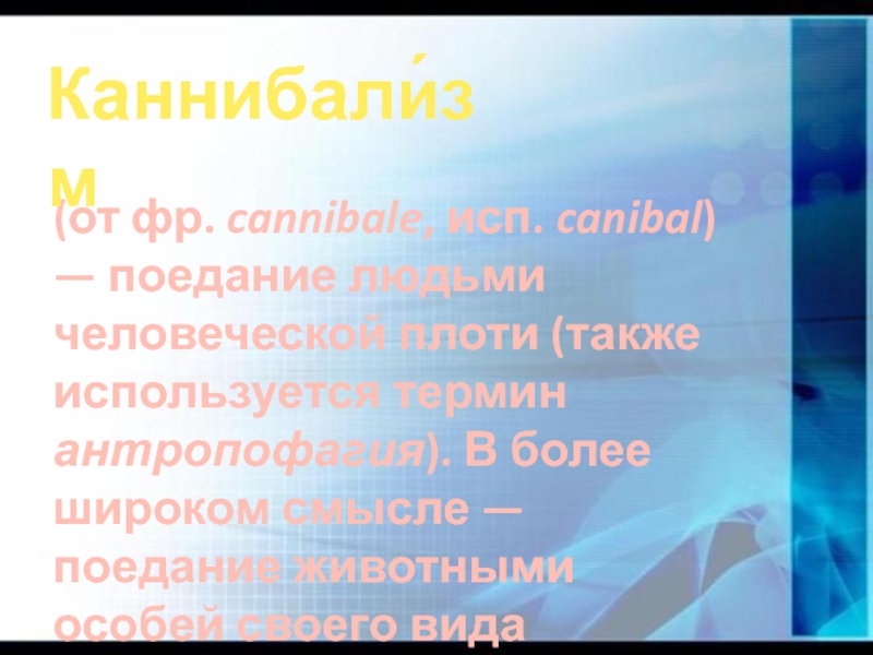 Слайд 31(от фр. cannibale, исп. canibal) — поедание людьми человеческой плоти (также используется термин антропофагия). В