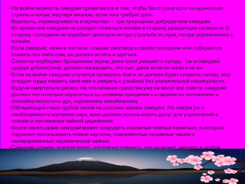 Обладающий лишь грубой силой не достоин звания самурая. Не говоря уж о необходимости изучения наук, воин должен использовать досуг для упражнений в поэзии и постижения чайной церемонии.