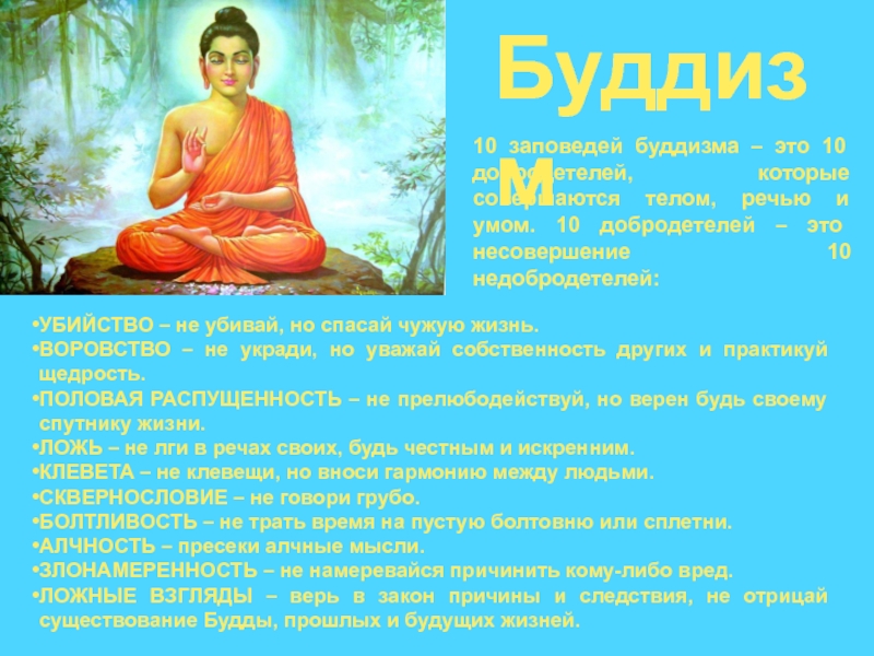 10 заповедей буддизма – это 10 добродетелей, которые совершаются телом, речью и умом. 10 добродетелей – это несовершение 10 недобродетелей: