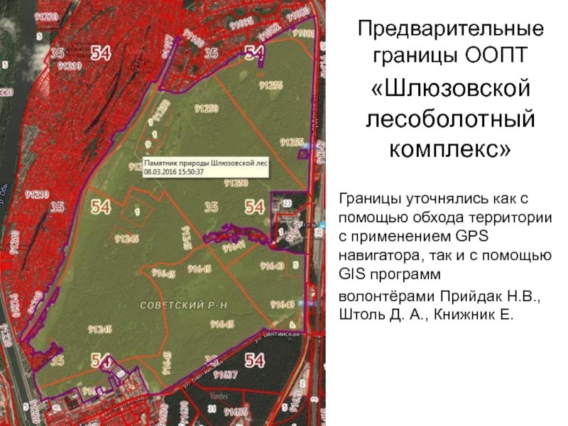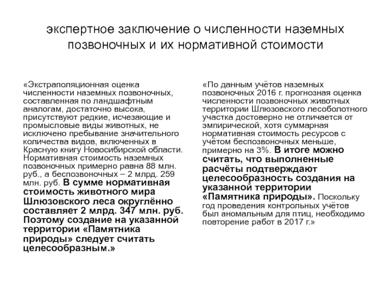 «По данным учётов наземных позвоночных 2016 г. прогнозная оценка численности позвоночных животных территории Шлюзовского лесоболотного участка достоверно не отличается от эмпирической, хотя суммарная нормативная стоимость ресурсов с учётом беспозвоночных меньше, примерно на 3%. В итоге можно считать, что выполненные расчёты подтверждают целесообразность создания на указанной территории «Памятника природы». Поскольку год проведения контрольных учётов был аномальным для птиц, необходимо повторение работ в 2017 г.»