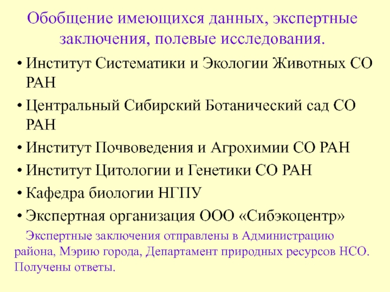 Обобщение имеющихся данных, экспертные заключения, полевые исследования.