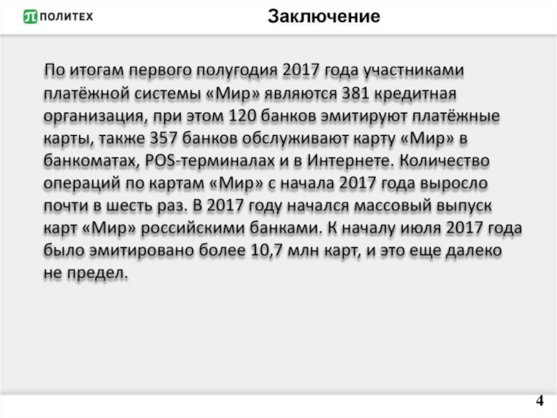 История• АО «Национальная система платёжных карт» создано 23 июля 2014 года. • В апреле 2015 года объявлен всероссийский творческий конкурс на лучшее название и товарный знак национальной платёжной системы, по итогам