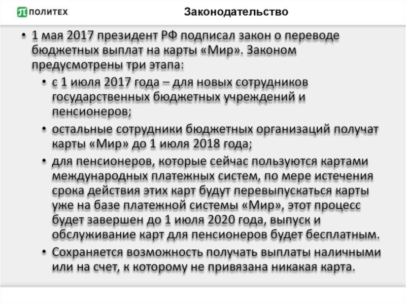 обстановки. • Бесплатный выпуск карты. • Низкие тарифы на обслуживание карты. • Широкая сеть приема карт в России и в популярных интернет-магазинах. • Снять наличные можно будет в любом банке после 1 июля 2017 года . • Карта обладает самым современным уровнем защиты. Карта «Мир» полностью соответствует всем российским и международным стандартам безопасности.