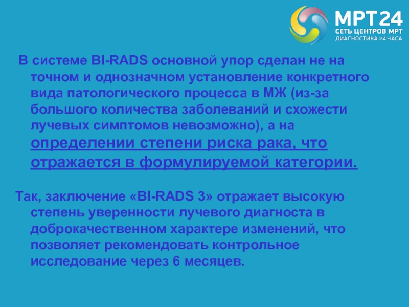 Так, заключение «BI-RADS 3» отражает высокую степень уверенности лучевого диагноста в доброкачественном характере изменений, что позволяет рекомендовать контрольное исследование через 6 месяцев.
