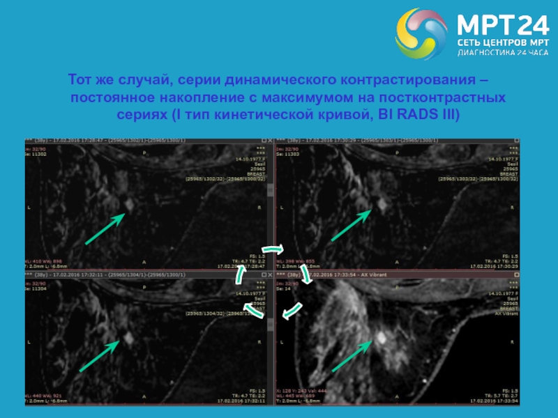 максимумом на постконтрастных сериях (I тип кинетической кривой, BI RADS