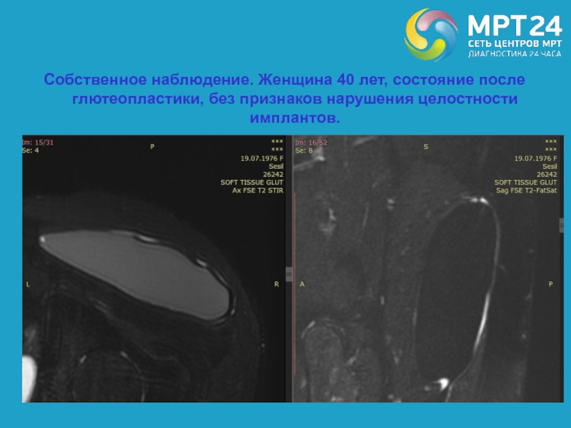 Слайд 94Собственное наблюдение. Женщина 40 лет, состояние после глютеопластики, без признаков