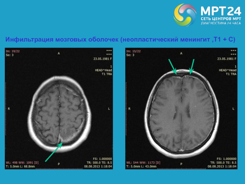 Инфильтрация мозговых оболочек (неопластический менингит ,Т1 + С)