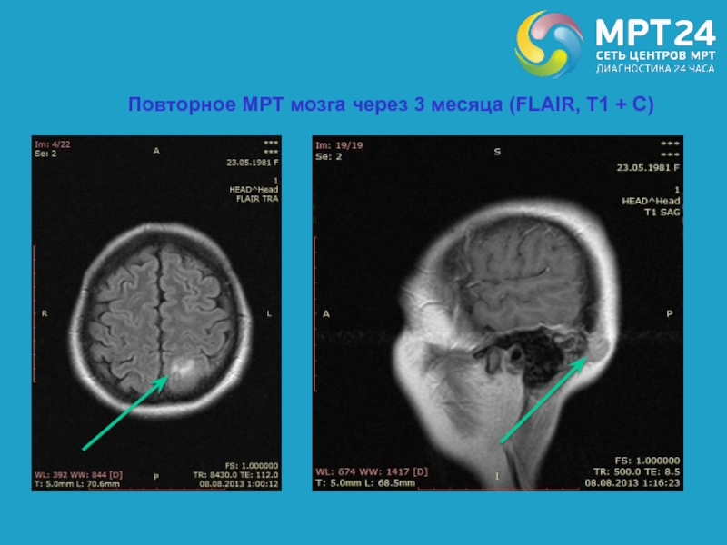Слайд 74Повторное МРТ мозга через 3 месяца (FLAIR, Т1 + С)