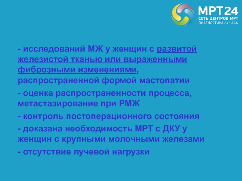 - исследований МЖ у женщин с развитой железистой тканью или