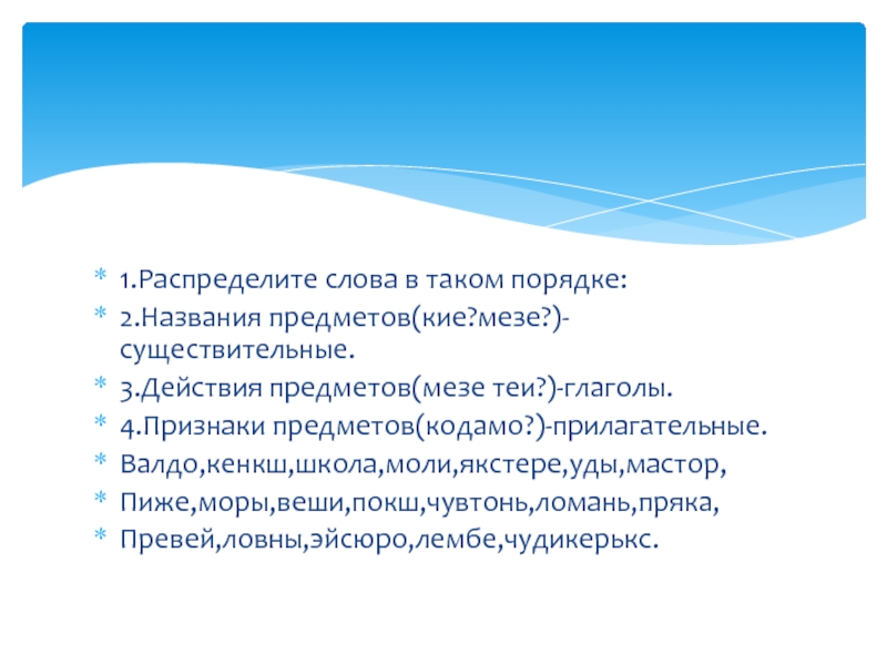 1.Распределите слова в таком порядке:2.Названия предметов(кие?мезе?)-существительные.3.Действия предметов(мезе теи?)-глаголы.4.Признаки предметов(кодамо?)-прилагательные.Валдо,кенкш,школа,моли,якстере,уды,мастор,Пиже,моры,веши,покш,чувтонь,ломань,пряка,Превей,ловны,эйсюро,лембе,чудикерькс.