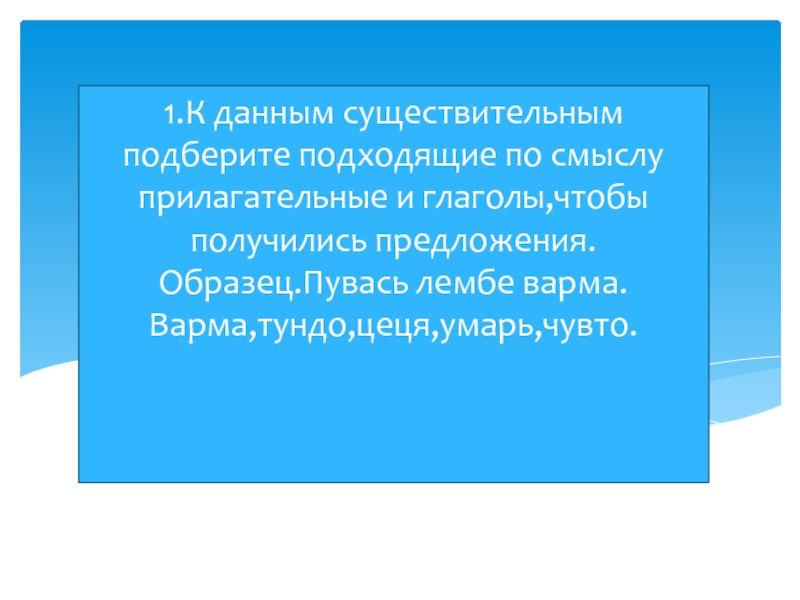 1.К данным существительным подберите подходящие по смыслу прилагательные и глаголы,чтобы получились предложения. Образец.Пувась лембе варма. Варма,тундо,цеця,умарь,чувто.