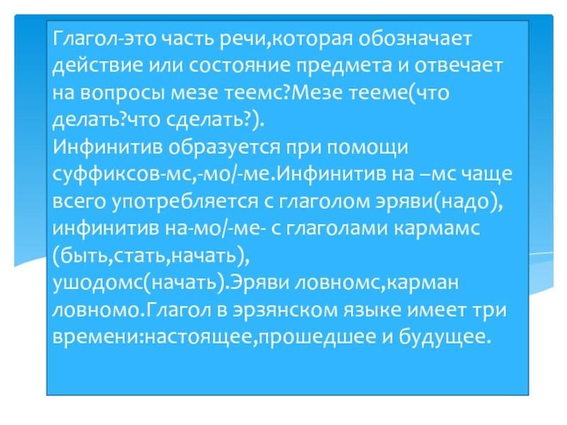 суффиксов-мс,-мо/-ме.Инфинитив на –мс чаще всего употребляется с глаголом эряви(надо),инфинитив на-мо/-ме- с глаголами кармамс(быть,стать,начать), ушодомс(начать).Эряви ловномс,карман ловномо.Глагол в эрзянском языке имеет три времени:настоящее,прошедшее и будущее.