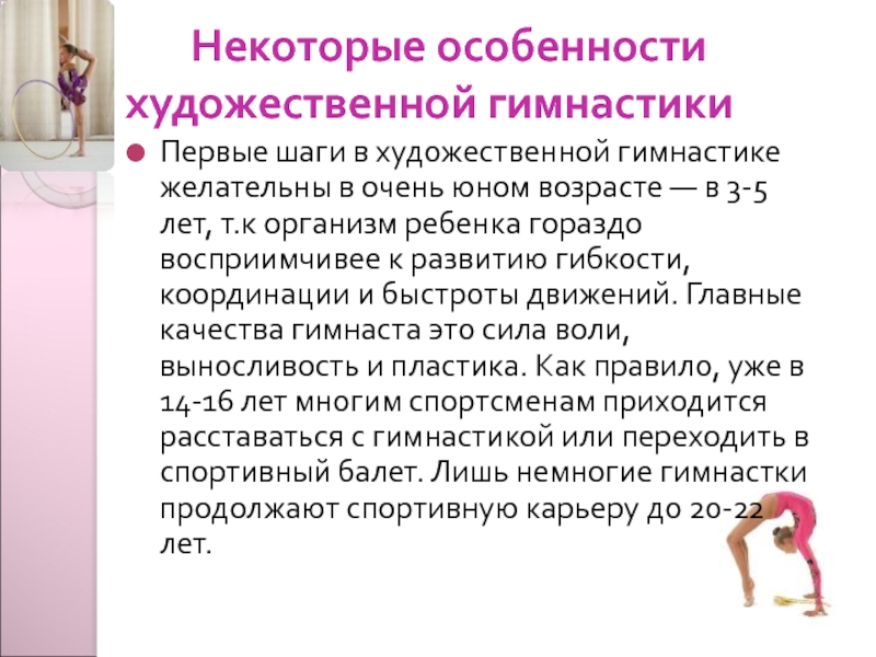 Некоторые особенности     художественной гимнастики Первые шаги в художественной гимнастике