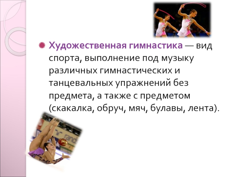 Художественная гимнастика — вид спорта, выполнение под музыку различных гимнастических и танцевальных упражнений без предмета, а также с предметом (скакалка, обруч, мяч, булавы, лента).