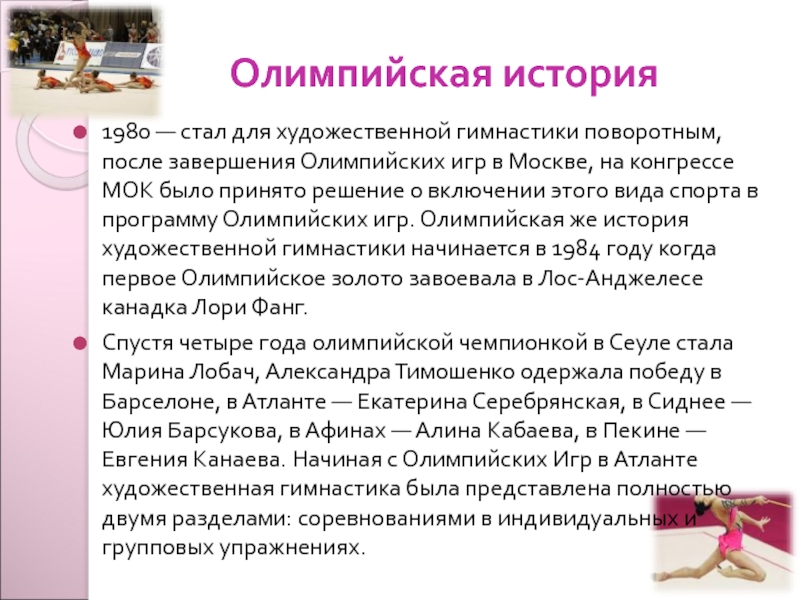МОК было принято решение о включении этого вида спорта в программу Олимпийских игр. Олимпийская же история художественной гимнастики начинается в 1984 году когда первое Олимпийское золото завоевала в Лос-Анджелесе канадка Лори Фанг.