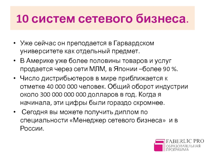 Число дистрибьютеров в мире приближается к отметке 40 000 000 человек. Общий оборот индустрии около 300 000 000 000 долларов в год. Когда я начинала, эти цифры были гораздо скромнее.