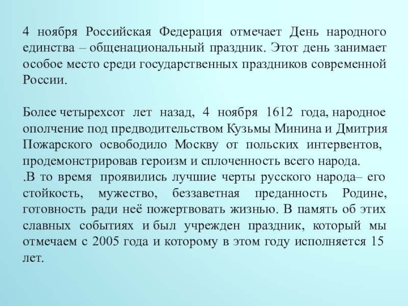лет назад, 4 ноября 1612 года, народное ополчение под предводительством Кузьмы Минина и Дмитрия Пожарского освободило Москву от польских интервентов, продемонстрировав героизм и сплоченность всего народа. .В то время проявились лучшие черты русского народа– его стойкость, мужество, беззаветная преданность Родине, готовность ради неё пожертвовать жизнью. В память об этих славных событиях и был учрежден праздник, который мы отмечаем с 2005 года и которому в этом году исполняется 15 лет.