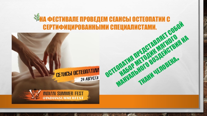 С 2016 г. наши опытные мастера проводят занятия йогой, ГОНГ-медитации, сеансы остеопатии и семинары с Метафорическими Ассоциативным картами.