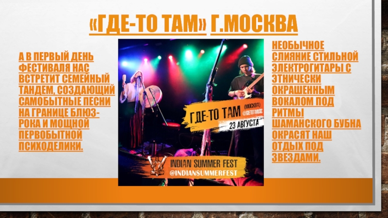 Каждое живое выступление группы, это неповторимое сочетание теплого органического звука, экзотического грува и яркой импровизации.