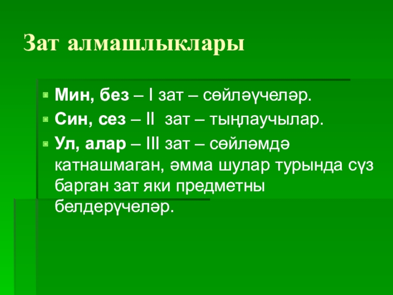Слайд 2Үзләрен атамыйча гына зат яки предметларга, аларның билгесе яки санына