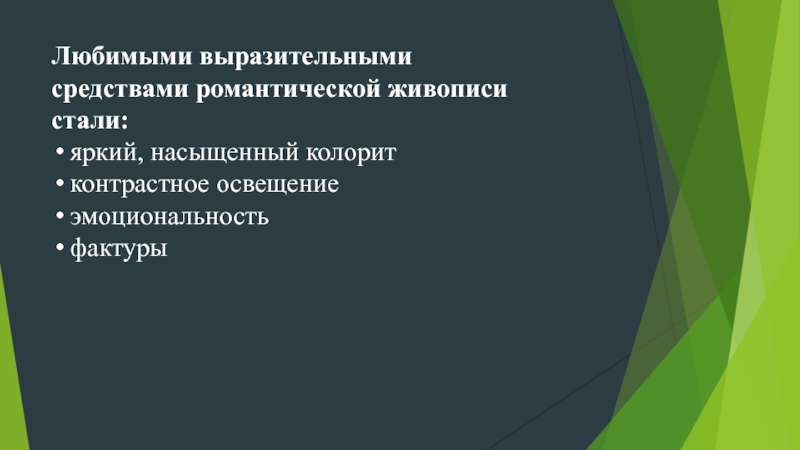 Любимыми выразительными средствами романтической живописи стали:яркий, насыщенный колорит контрастное освещение эмоциональность фактуры