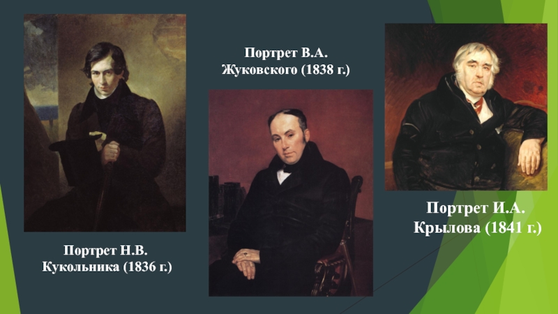 Портрет Н.В. Кукольника (1836 г.)Портрет В.А. Жуковского (1838 г.)Портрет И.А. Крылова (1841 г.)