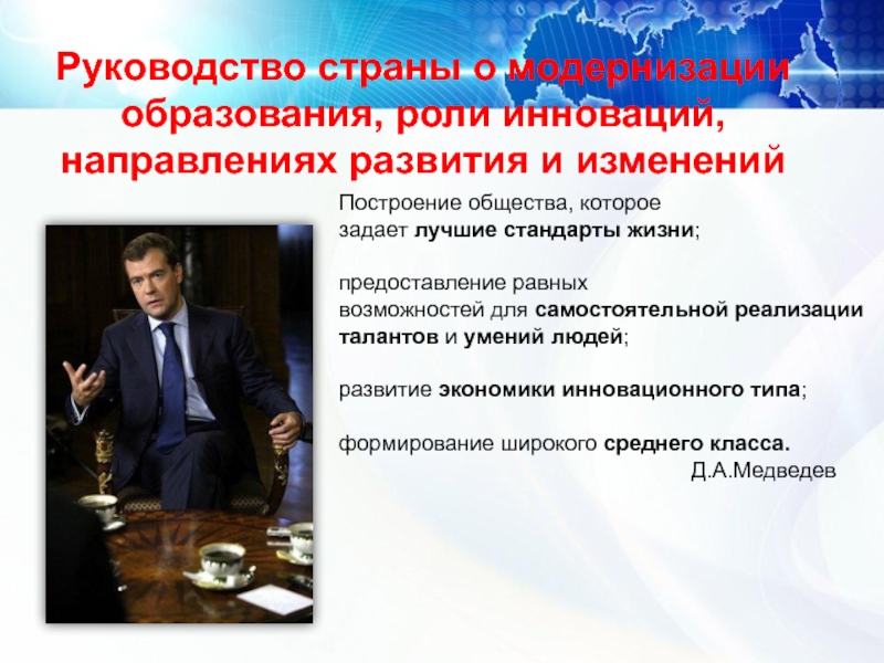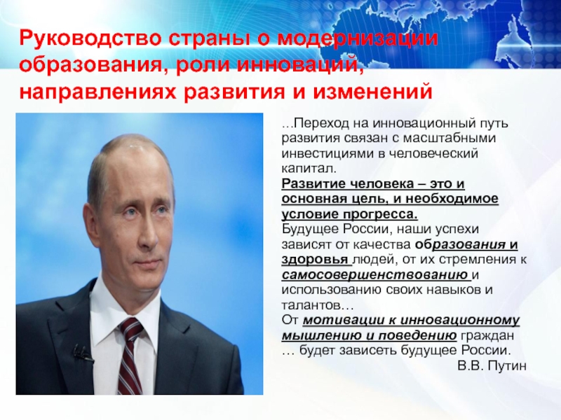 Слайд 4Руководство страны о модернизации образования, роли инноваций, направлениях развития и