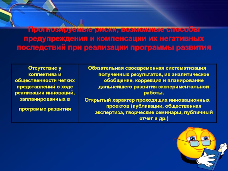 Слайд 86Прогнозируемые риски, возможные способы предупреждения и компенсации их негативных последствий