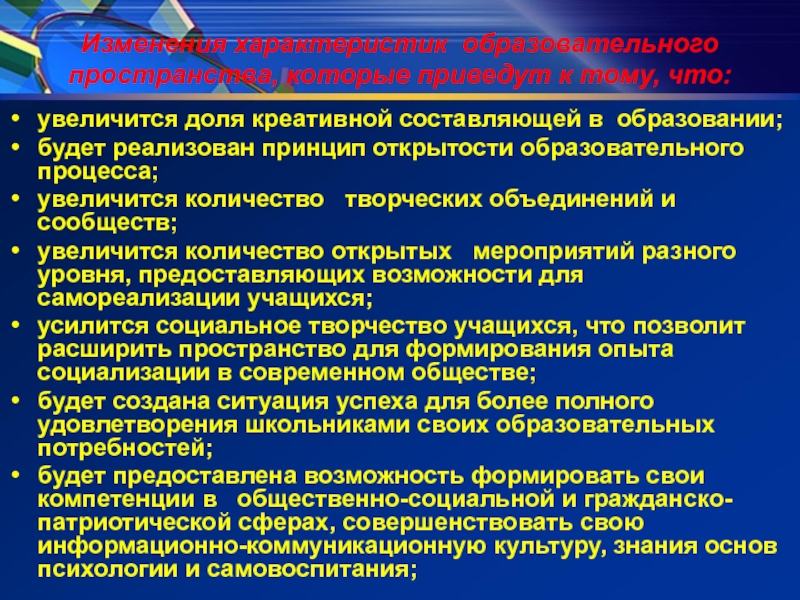 Слайд 95Изменения характеристик образовательного пространства, которые приведут к тому, что: