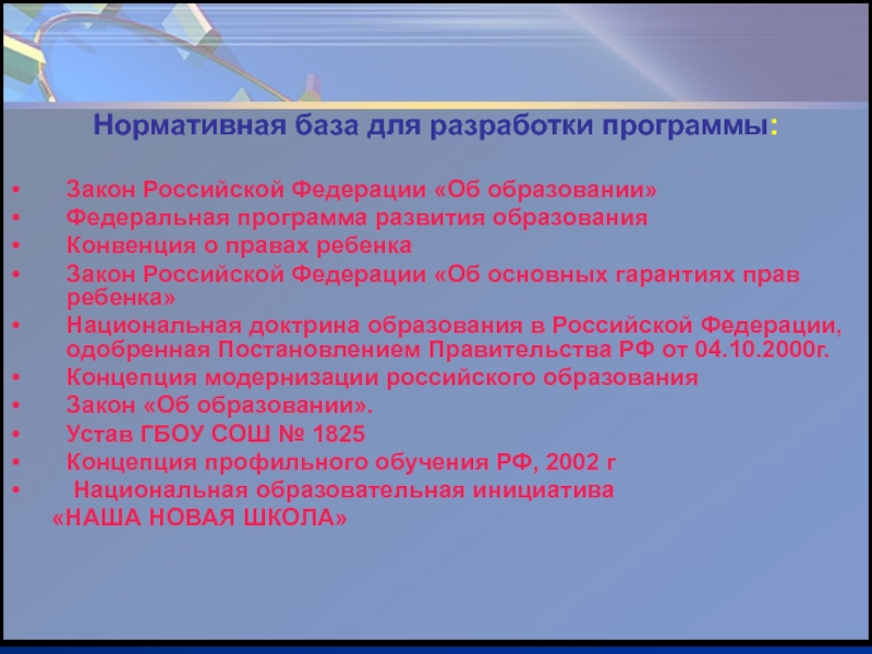 Национальная доктрина образования в Российской Федерации, одобренная Постановлением Правительства РФ от 04.10.2000г.