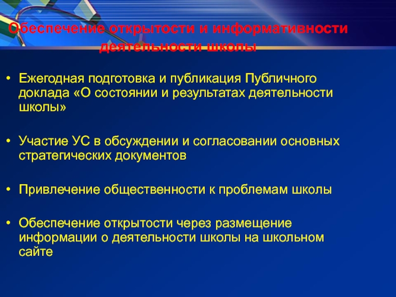 Слайд 88Обеспечение открытости и информативности деятельности школы