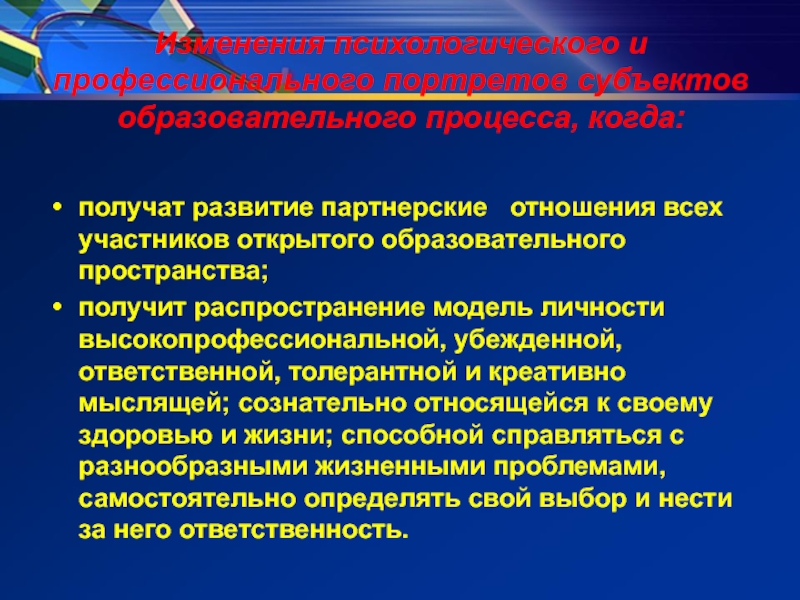 Слайд 94Изменения психологического и профессионального портретов субъектов образовательного процесса, когда: