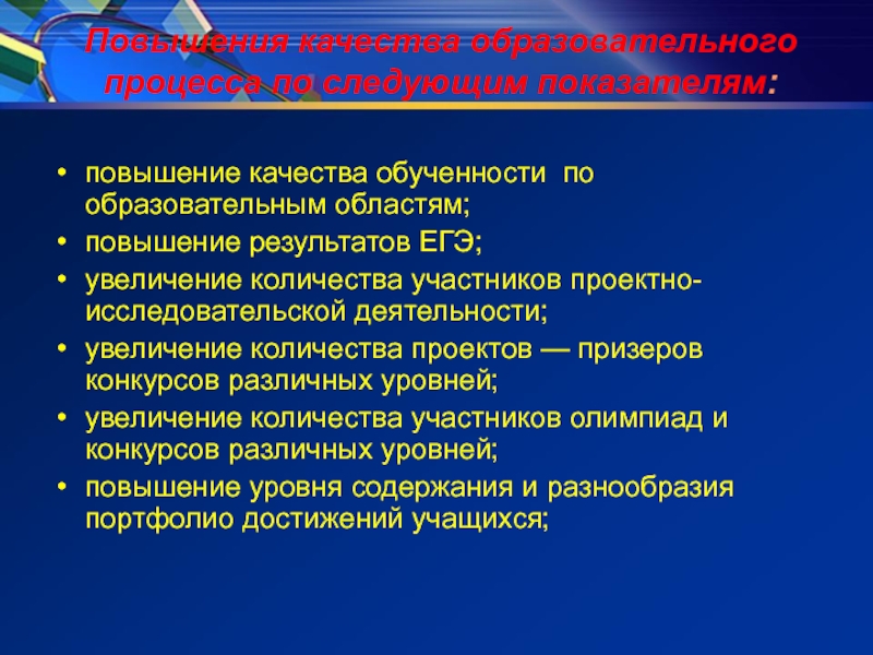 Слайд 93Повышения качества образовательного процесса по следующим показателям: