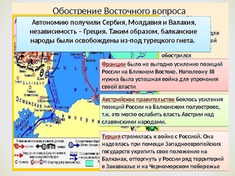 Наличие на Балканах, в составе Османской империи, славянских христианских народов, которые боролись за свою независимость. Россия оказывала им поддержку, тем самым вызывая волну возмущения турок по поводу вмешательства России во внутренние дела другого государства.
