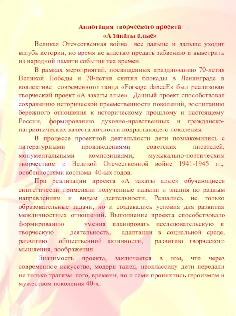 Аннотация творческого проекта «А закаты алые»Великая Отечественная война все дальше и дальше уходит вглубь истории, но время не властно предать забвению и выветрить из народной памяти события тех времен. В рамках мероприятий,