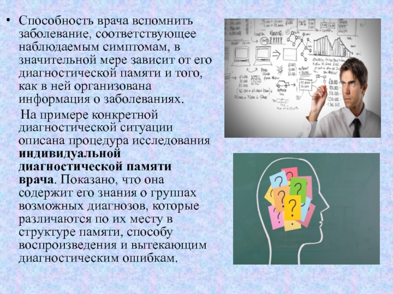 Слайд 3Способность врача вспомнить заболевание, соответствующее наблюдаемым симптомам, в значительной мере