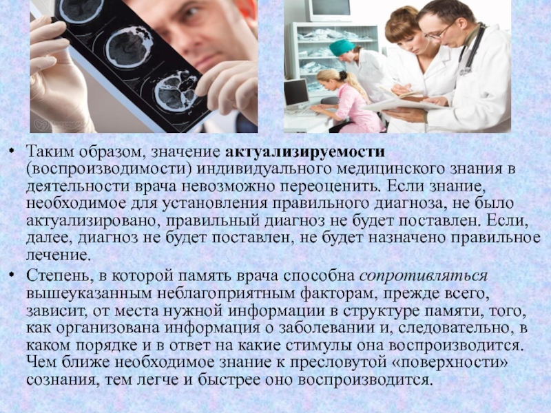 Слайд 9Таким образом, значение актуализируемости (воспроизводимости) индивидуального медицинского знания в деятельности