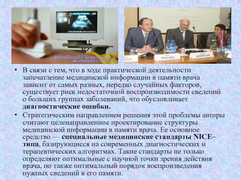 Стратегическим направлением решения этой проблемы авторы считают целенаправленное проектирование структуры медицинской информации в памяти врача. Ее основное средство — специальные медицинские стандарты NICE–типа, базирующиеся на современных диагностических и терапевтических алгоритмах. Такие стандарты не только определяют оптимальные с научной точки зрения действия врача, но также оптимальный порядок воспроизведения нужных сведений в его памяти.