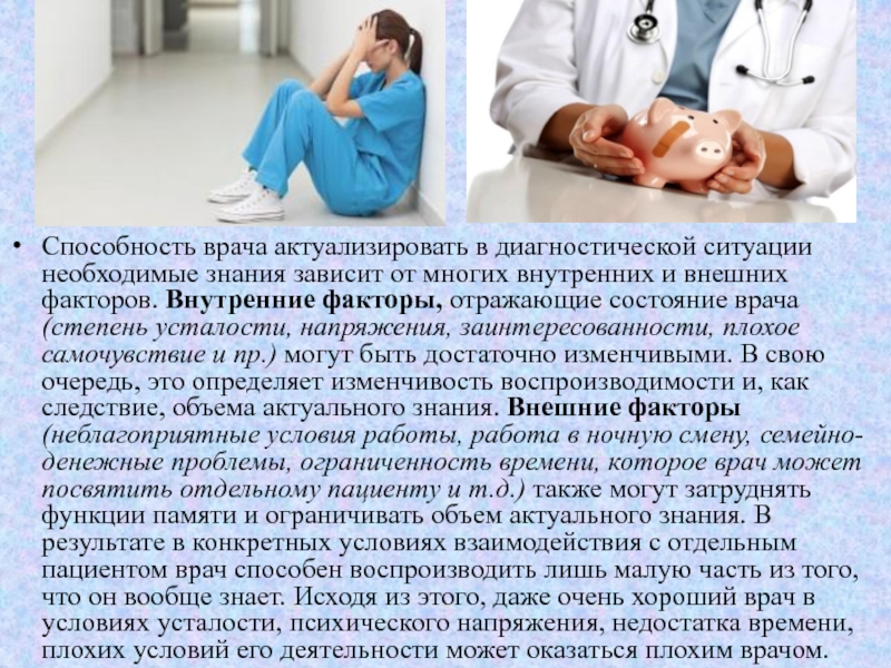 (степень усталости, напряжения, заинтересованности, плохое самочувствие и пр.) могут быть достаточно изменчивыми. В свою очередь, это определяет изменчивость воспроизводимости и, как следствие, объема актуального знания. Внешние факторы (неблагоприятные условия работы, работа в ночную смену, семейно-денежные проблемы, ограниченность времени, которое врач может посвятить отдельному пациенту и т.д.) также могут затруднять функции памяти и ограничивать объем актуального знания. В результате в конкретных условиях взаимодействия с отдельным пациентом врач способен воспроизводить лишь малую часть из того, что он вообще знает. Исходя из этого, даже очень хороший врач в условиях усталости, психического напряжения, недостатка времени, плохих условий его деятельности может оказаться плохим врачом.