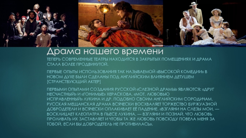 Драма нашего времениТеперь современные театры находится в закрытых помещениях и драма стала более продвинутой.Первые опыты использования так