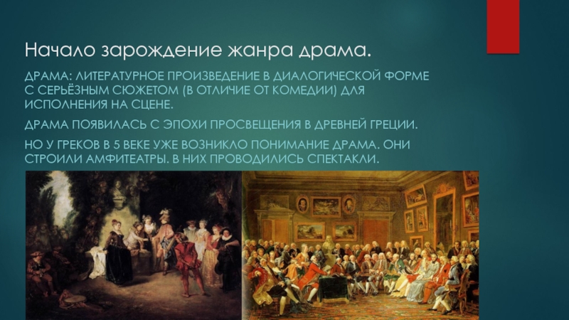 Начало зарождение жанра драма.драма: Литературное произведение в диалогической форме с серьёзным сюжетом (в отличие от комедии) для исполнения на сцене.Драма появилась с эпохи Просвещения в древней греции.Но у греков в 5