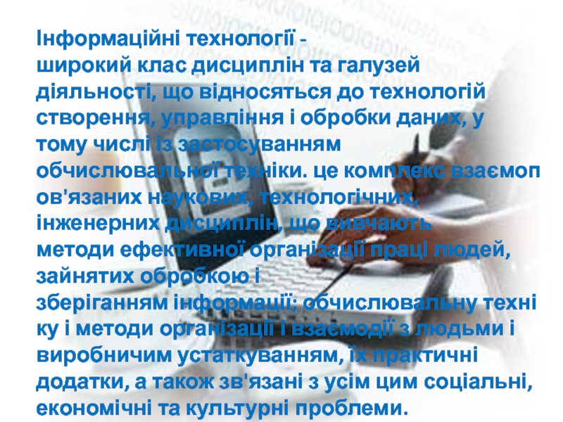 Слайд 2Інформаційні технології - широкий клас дисциплін та галузей діяльності, що відносяться до технологій створення, управління
