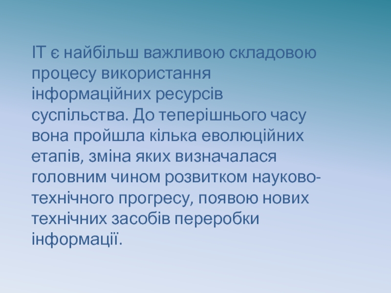 ІТ є найбільш важливою складовою процесу використання інформаційних ресурсів суспільства. До теперішнього часу вона пройшла кілька еволюційних етапів,