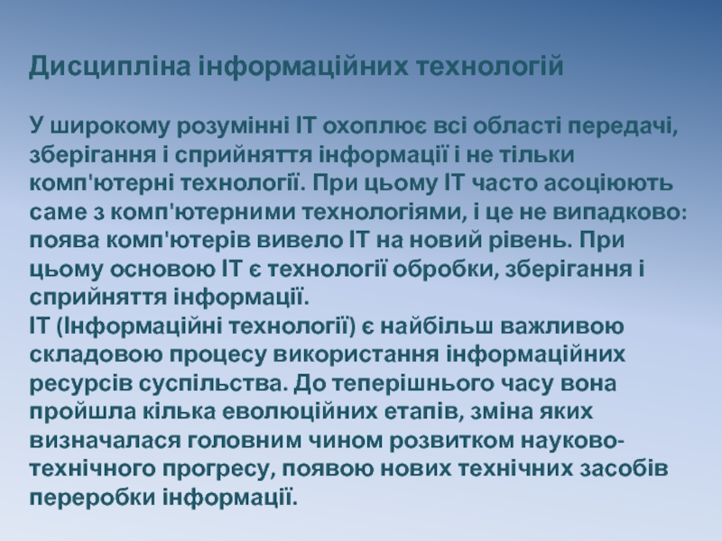 Дисципліна інформаційних технологій  У широкому розумінні ІТ охоплює всі області передачі, зберігання і сприйняття інформації і