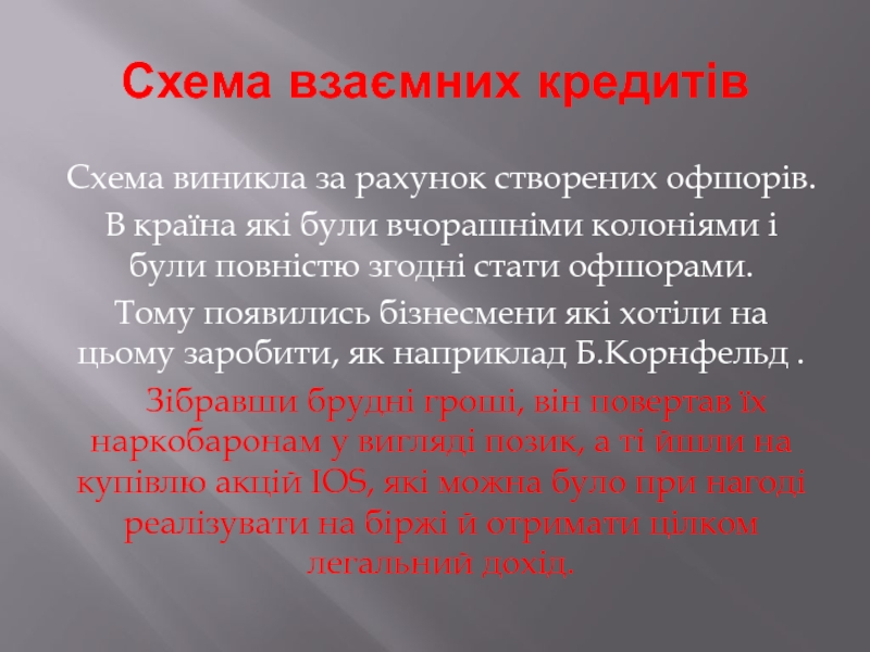 Зібравши брудні гроші, він повертав їх наркобаронам у вигляді позик, а ті йшли на купівлю акцій IOS, які можна було при нагоді реалізувати на біржі й отримати цілком легальний дохід.