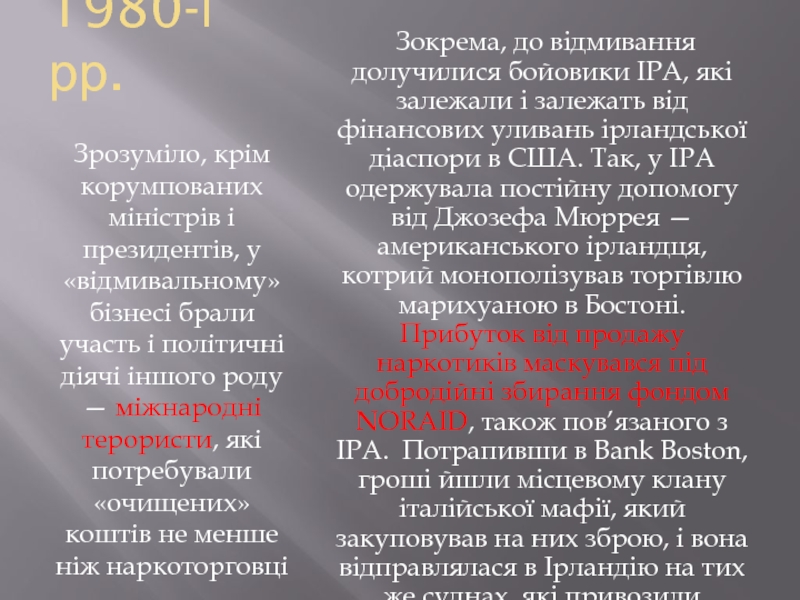 Зокрема, до відмивання долучилися бойовики ІРА, які залежали і залежать від фінансових уливань ірландської діаспори в США. Так, у ІРА одержувала постійну допомогу від Джозефа Мюррея — американського ірландця, котрий монополізував торгівлю марихуаною в Бостоні. Прибуток від продажу наркотиків маскувався під добродійні збирання фондом NORAID, також пов’язаного з ІРА. Потрапивши в Bank Boston, гроші йшли місцевому клану італійської мафії, який закуповував на них зброю, і вона відправлялася в Ірландію на тих же суднах, які привозили марихуану.