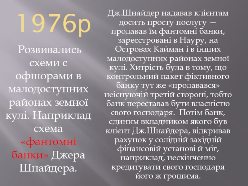 послугу — продавав їм фантомні банки, зареєстровані в Науру, на Островах Кайман і в інших малодоступних районах земної кулі. Хитрість була в тому, що контрольний пакет фіктивного банку тут же «продавався» неіснуючій третій стороні, тобто банк переставав бути власністю свого господаря. Потім банк, єдиним вкладником якого був клієнт Дж.Шнайдера, відкривав рахунок у солідній західній фінансовій установі й міг, наприклад, нескінченно кредитувати свого господаря його ж грошима.