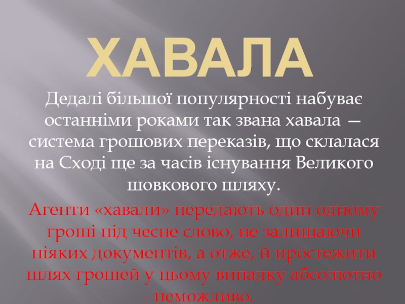 Агенти «хавали» передають один одному гроші під чесне слово, не залишаючи ніяких документів, а отже, й простежити шлях грошей у цьому випадку абсолютно неможливо.