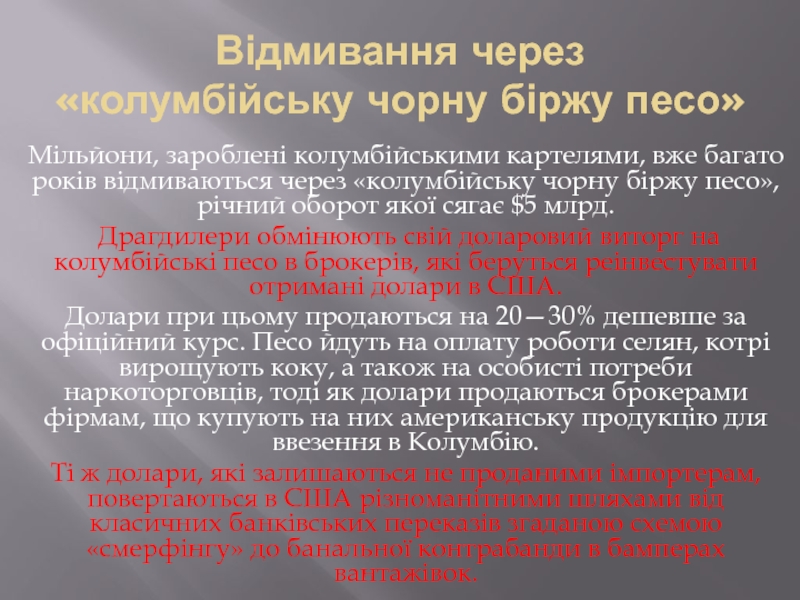 Драгдилери обмінюють свій доларовий виторг на колумбійські песо в брокерів, які беруться реінвестувати отримані долари в США.