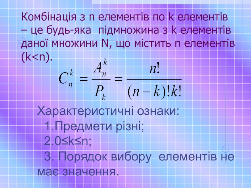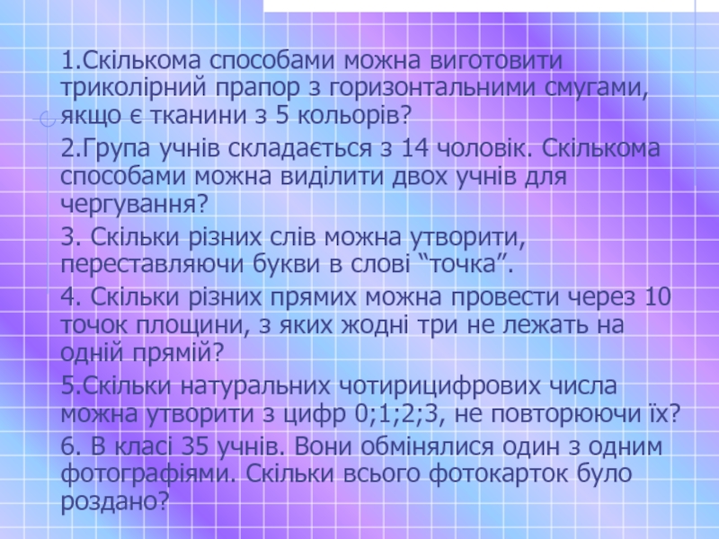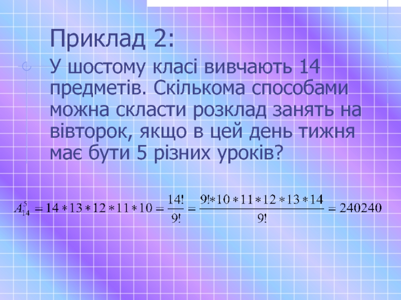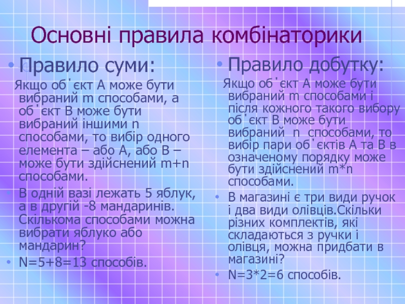Якщо об΄єкт А може бути вибраний m способами і після кожного такого вибору об΄єкт В може бути вибраний n способами, то вибір пари об΄єктів А та В в означеному порядку може бути здійснений m*n способами.